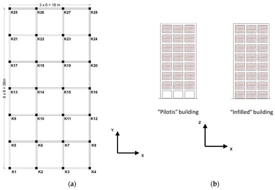 Herein, an extensive parametric study is conducted aiming to evaluate the seismic response of two eight-storey reinforced concrete frame buildings (Figure 5) which interact with shorter structures. The two buildings were designed according to the European codes [,] in the context of previous studies [,]. Their structural systems are identical and the only difference between them is that the one is fully infilled with masonry panels while the other has soft ground storey (pilotis configuration).