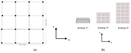 The eight-storey buildings interact with three shorter structures: a one-storey very stiff (rigid) structure (building “1”) and three-storey and six-storey common reinforced concrete buildings (buildings “3” and “6”, respectively). Their plan view and the outline of their view in elevation are shown in Figure 6. Building “1” is a virtual structure which is modeled by fixing one node of the “gap” elements simulating the contact area. Buildings “3” and “6” are common reinforced concrete frame buildings designed according to Eurocodes 2 and 8 [,]. Both are fully infilled with 10 cm thick masonry panels. The material properties, the modeling assumptions, the seismic loading parameters, and the analysis method applied for their design are identical to those adopted for the eight-storey buildings [,].