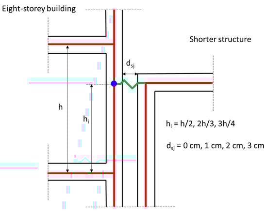 - I1sjw: Asymmetric seismic interaction between “infilled” and “1” buildings for varying seismic joint width (dsj = 0 cm, 1 cm, 2 cm) and constant impact point location (hi = 2h/3);