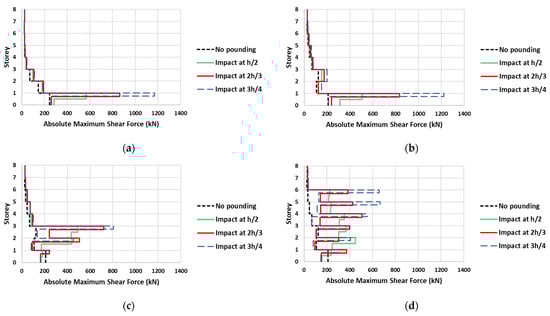 Maximum absolute shear forces of column Κ4 along X axis due to excitation “1+”: (a) P1ipl; (b) I1ipl; (c) I3ipl; (d) I6ipl.