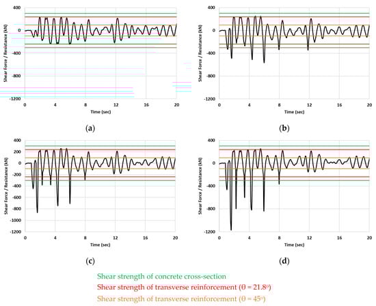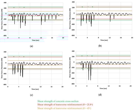 In Figure 14, the time histories of the developing shear forces of column Κ4 along the X axis at the top of the third storey are presented. The figure refers to the I3sjw analysis series applying the first 20 s of the “1-” excitation. The shear resistances of the column cross-section and the transverse reinforcement, determined according to Eurocode 2 [] for the two limits of the crack angle θ, are plotted as well. These resistances are calculated using the mean values of material properties without any safety factors. The presented results include the time histories for (i) structures in contact (dsj = 0 cm), (ii) structures that have a small separation gap equal to 1 cm (dsj = 1 cm), (iii) structures that have a small separation gap equal to 2 cm (dsj = 2 cm), and, finally, (iv) structures that have a small separation gap equal to 3 cm (dsj = 3 cm). The results plotted in Figure 14 support and verify the remarks extracted from Figure 13. Indeed, it seems that the maximum shear force occurs for the largest width (dsj = 3 cm) of the separation gap (over 25% larger than dsj = 0 cm). Furthermore, it is emphasized that, regardless of the gap size, the developing shear forces exceed the shear strength of the column during seismic excitation many times over.