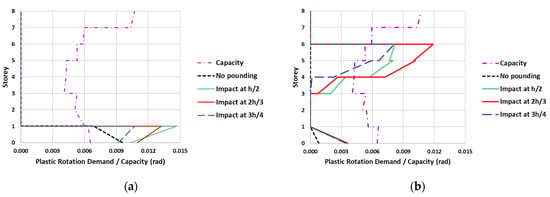 Figure 11 illustrates the maximum absolute plastic rotation demands along the height of column Κ4 due to excitation “1-”. More specifically, Figure 11 presents the plastic rotations around the Y axis for the analysis series P1ipl and I6ipl. The corresponding capacities which are calculated in accordance with Eurocode 8, Part 3 [], are plotted as well. For the no-pounding case, plastic deformations occur at the ground storey only. The asymmetric seismic interaction between buildings “infilled” and “6” amplifies the deformation demands of the ground storey up to about 3.5 times regardless of the exact position of the impact point. Concerning the interaction between buildings “pilotis” and “1”, the amplification strongly depends on hi. It is more pronounced for hi = h/2 and 2h/3 (about two times), while for hi = 3h/4, the plastic rotation demand increases about 50%. In addition, plastic deformations develop at the middle storeys (fourth, fifth, sixth) for the I6ipl analysis series (Figure 11b). The plastic deformation capacities are exceeded by a maximum of about 2.5 times. This value corresponds to hi = 2h/3.