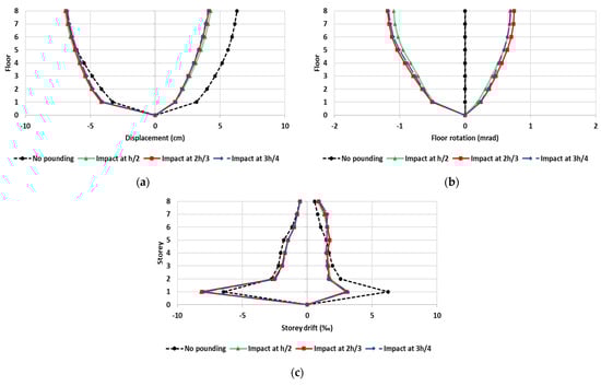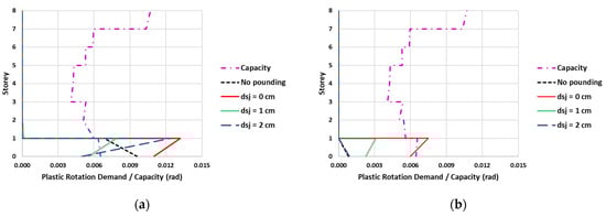Similar findings can also be derived from the study of the deformation demands. Figure 15 illustrates the maximum absolute plastic rotation demands along the height of column Κ4 due to excitation “1-” for the analysis series P1sjw and I1sjw, along with the corresponding capacities. The latter is calculated in accordance with Eurocode 8, Part 3 []. Figure 15 illustrates the maximum absolute plastic rotation demands along the height of column Κ4 due to excitation “1-”. More specifically, Figure 15 presents the plastic rotations around the Y axis for the analysis series P1sjw and I1sjw. The corresponding capacities, which are calculated in accordance with Eurocode 8, Part 3 [], are plotted as well. Obviously, the asymmetric seismic interaction amplifies the deformation demands of the ground storey even exceeding the corresponding capacity. Concerning the I1sjw analysis series, as anticipated, the amplification increases with decreasing dsj (Figure 15b). However, for the P1sjw analysis series (Figure 15a), the deformation demands for dsj = 2 cm are larger than those for dsj = 1 cm. Analogous observations can be made regarding the floor displacements and storey drifts. As an example, the minimum and maximum floor translations and rotations as well as storey drifts produced by the excitation “1-” for the analysis I3sjw are given in Figure 16. Such unexpected results have been reported by previous studies too [,,], but they have not yet been sufficiently explained and interpreted. In the authors’ opinion, they should be attributed to the inherent uncertainty of the non-linear behavior. In particular, the ensemble of the interacting structures constitutes a complicated dynamic system with unknown dynamic characteristics (natural periods and modes cannot be determined) which depend on dsj. This fact, in conjunction with the frequency content of the ground motion, might cause such peculiar results. However, this conclusion is very difficult to verify. Conclusively, keeping small seismic joints, not efficient to completely preclude pounding, may not mitigate the consequences of asymmetric seismic interaction.