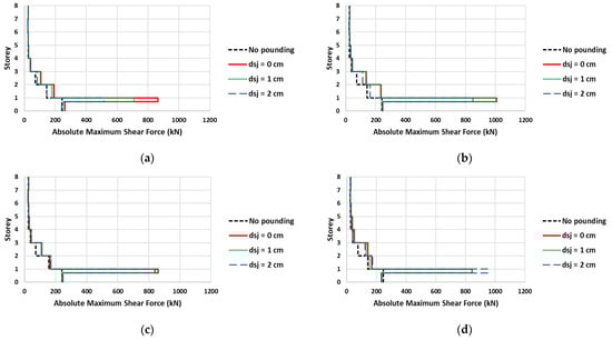 In Figure 13, the influence of seismic joint width on the developing maximum absolute shear forces of column Κ4 along the X axis is presented. The figure refers to the interaction between “pilotis” and “1” buildings for dsj equal to 0 cm, 1 cm, and 2 cm (analysis series P1sjw) and for the no-pounding case. The dashed black lines represent the developing shear forces without pounding, while the solid red, double green, and dashed blue lines correspond to seismic joint widths equal to 0 cm, 1 cm, and 2 cm, respectively. The impact point height is considered equal to 2h/3. It is apparent that the seismic interaction phenomenon leads to an excessive augmentation (up to four times) of the shear forces of the ground floor where the collisions take place. Concerning the influence of dsj, while the results for excitation “1+” are consistent with the general trend reported in the literature, this is not the case for the remaining excitations. From Figure 13b,c, it can be observed that small gaps do not really mitigate the impact consequences, since the developing shear forces resulting from the different values of dsj are almost equal. Furthermore, for the “2-” excitation (Figure 13d) column Κ4 experiences over 12% larger shear forces for dsj = 2 cm in comparison with dsj = 0 cm or 1 cm.