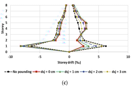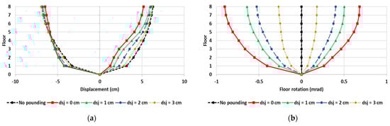 The typical measure against the consequences of seismic interactions is the provision of a seismic joint (joint width dsj) between the interacting structures. For reference purposes, it is worth reporting that the minimum values of dsj specified by Eurocode 8 [] are 3 cm, 3.3–3.6 cm, and 6.5–6.8 cm for the interaction cases between the eight-storey and “1”, “3”, and “6” buildings, respectively. The influence of the joint width on the pounding problem has already been the subject of numerous papers in the literature [,,,,,,,,,,,,,,,,]. In general, the relevant publications are consistent in that by increasing the seismic joint width, the consequences of pounding are mitigated. However, many exceptions from this conclusion are reported in several studies [,,]. Nevertheless, although this is a key issue related to the destructiveness of the pounding effect, it has not been given due attention. Thus, many engineering practitioners and building constructors think that ensuring even a small gap size, which is not able to completely preclude pounding, is always beneficial for the structures. This misbelief enables the risk of misapplication of code provisions prescribing a minimum seismic joint width.