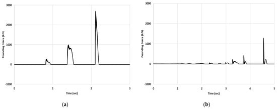 Time histories of pounding forces acting on the third storey of column Κ4 for interaction cases: (a) “P3-1+”; (b) “I3-2-”.