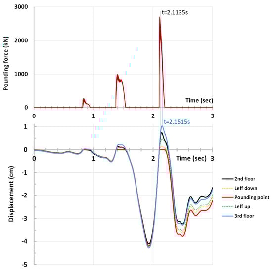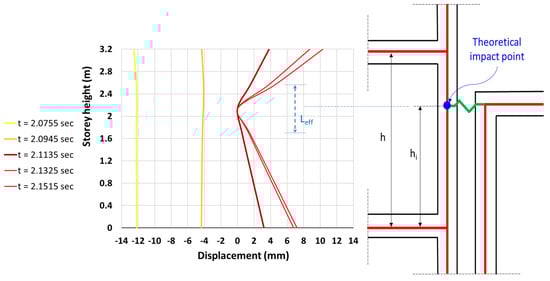 Furthermore, in Figure 18, the time history of the pounding force acting on the third storey of column K4 (also shown in Figure 17a) along with the time histories of the displacements of characteristic points of the same column for interaction case “P3-1+” are illustrated. In particular, five points are selected from bottom to top: the bottom (second floor level), the lower point of the effective impact length, the theoretical impact point, the upper point of the effective impact length, and the top (third floor level). The time points where the pounding force and the displacements are maximized are highlighted (t = 2.1135 s and t = 2.1515 s, respectively). In addition, Figure 19 illustrates the deformation of column K4 in the third storey at discrete time points around the moment that the pounding force is maximized. Starting from the time that the displacements are minimized (around t = 1.9 s—Figure 18) and the interacting buildings vibrate independently, it is apparent that the “pilotis” building moves towards building “3” until a collision takes place just before t = 2.1135 s. At that moment, the pounding force starts to increase rapidly and, in a very short time period, is maximized. Concurrently, the displacements continue to increase and take their maximum value 0.038 s after the pounding force. From this point on, the “pilotis” building starts to move away from building “3”. From Figure 19, it can be observed that during the contact of the interacting buildings, the effective impact length of column K4 experiences extensive inelastic deformations.