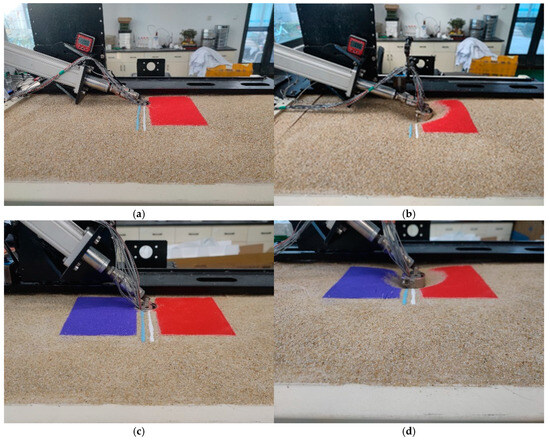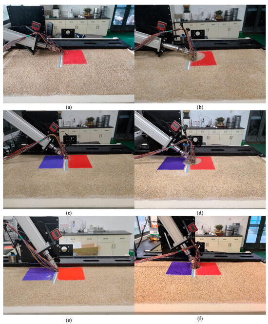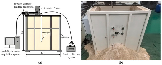 As shown in Figure 1, the test model box measures 1 m (length) × 0.7 m (width) × 1 m (height), meeting the boundary conditions. A steel frame capable of 180° free rotation is installed on top of the model box. The loading device features a high-stroke, high-load servo cylinder system with a maximum displacement stroke of 30 cm and a maximum push/pull force of 6 kN, enabling continuous, uninterrupted, and cyclic loading. Additionally, the equipment includes a displacement sensor, a displacement acquisition system, and other components.