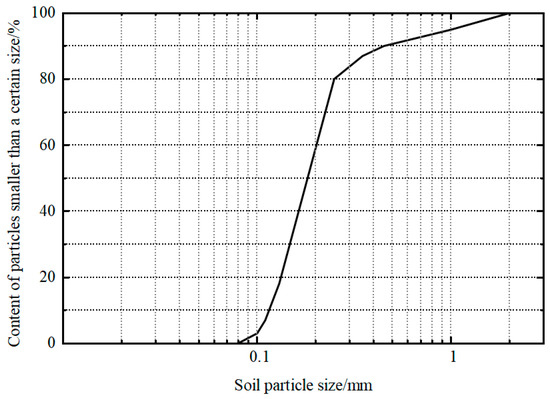 Fujian standard sand was used as the foundation soil for this experiment, and its grading curve is shown in Figure 2. Layer compaction every 10 cm thickness, followed by tamping and smoothing treatment to enhance bonding strength. During the compaction process, the density of the sand was measured three times, with an average value of approximately 1.77 g/cm3 and a variation within 5%, yielding an average relative density Dr of around 62%. The mechanical properties of the sandy soil are shown in Table 1.