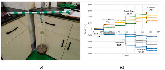 Stress sheet pasting and calibration of model piles. (a) Diagram of strain gauge and loading point; (b) calibration of model piles; and (c) calibration test data.