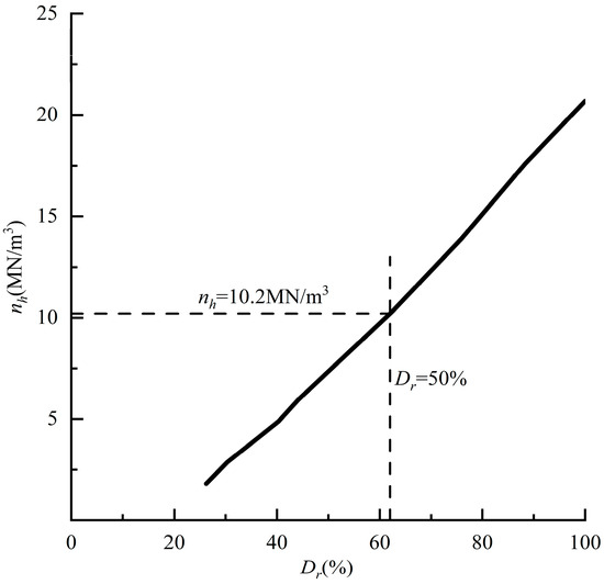 where T/L is the pile–soil relative stiffness; EpIp is the pile’s flexural stiffness; and nh is the foundation reaction modulus (nh in this paper is 10.2 MN/m3, based on the recommended value from the U.S. ACE manual (Figure 4)).