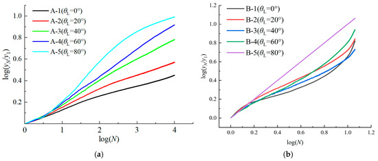 The relationship between yN/y1 and N for each test group in Figure 10 was processed using a double logarithmic scale, as shown in Figure 10. The log–log plot of yN/y1 versus N reveals an approximately clear proportional relationship.