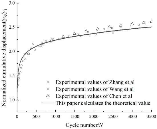 At present, there is a lack of studies on cyclic loading considering inclination in the inclined angle. To further verify the validity of Equation (8), several representative numbers of cycles were selected. Using Equation (8), the experimental parameters in Table 4 were calculated to obtain the klN/kl1 values for each group, which were then compared with the actual test data of klN/kl1. The results are shown in Table 5.