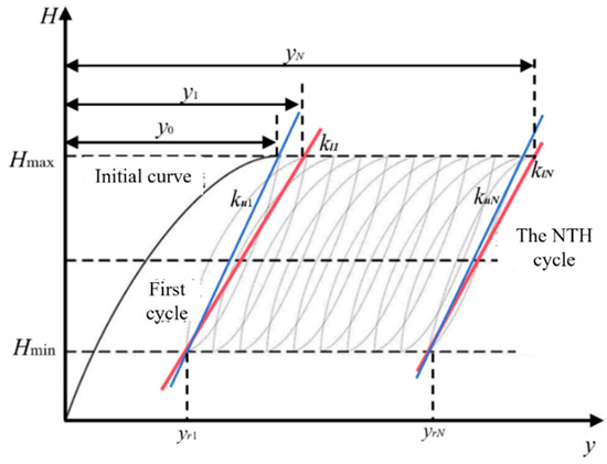 where yN and yrN represent the peak displacement and residual displacement, respectively, during the Nth cyclic loading. The definitions of these two types of stiffness are illustrated in Figure 13.
