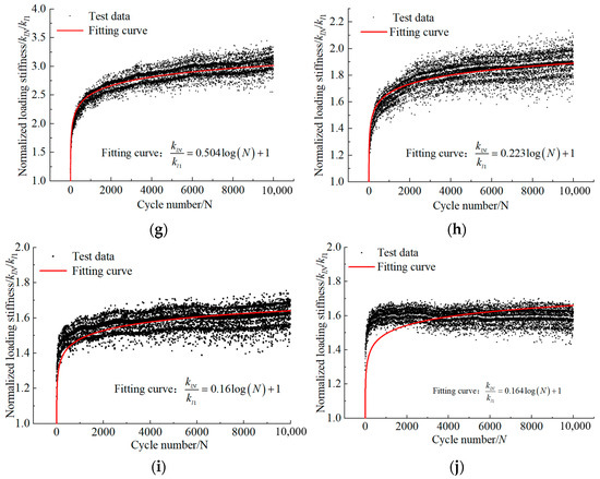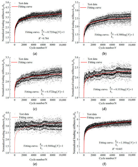 According to Equation (9), the load–displacement curve data are processed to obtain the klN value, which is then normalized by dividing klN by kl1 (the initial cycle loading stiffness). Figure 14 shows the relationship of the normalized cyclic loading stiffness (klN/kl1) varying with N.