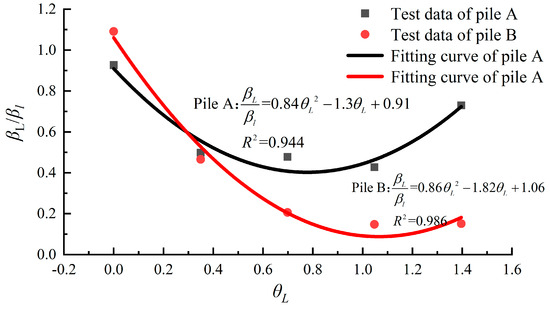 Figure 15 shows that the klN/kl1 of piles A and B varies inconsistently with θL, and the two sets of data cannot be fitted together. The fitting results from Chen et al. [21] primarily focus on semi-rigid piles. This study distinguishes the differences in the variation of cyclic loading stiffness with θL between semi-rigid piles and slender piles: