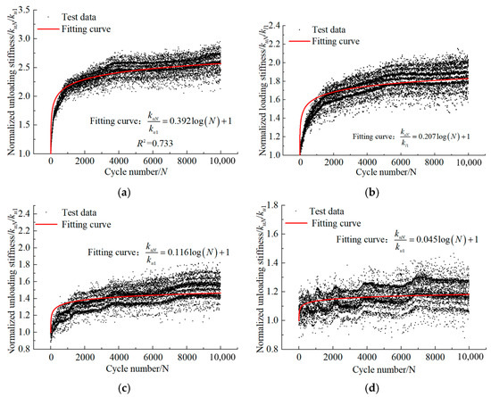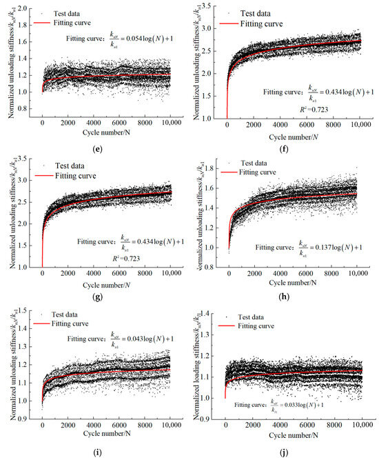 To further investigate the characteristics of stiffness variation during cyclic loading and cyclic unloading, this study defines the cyclic loading stiffness under the Nth cyclic as klN and the corresponding cyclic unloading stiffness as kuN.