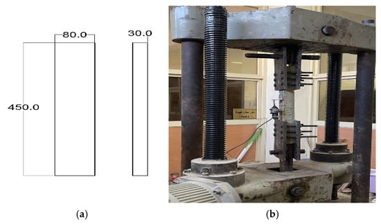 The direct tension strength and stress–strain curve under direct tension were assessed for UHPFRC and CLC according to RILEM TC 232-TDT [52,53]. Three prism specimens were cast horizontally and evaluated under uniaxial tensile loading, as shown in Figure 1. These prisms were rectangular with a cross-section 80 mm in width, 30 mm in thickness, and 450 mm in length. The direct tensile tension strength was assessed using a Universal Testing Machine (SHIMADZU, Japan) with 300 kN capacity.