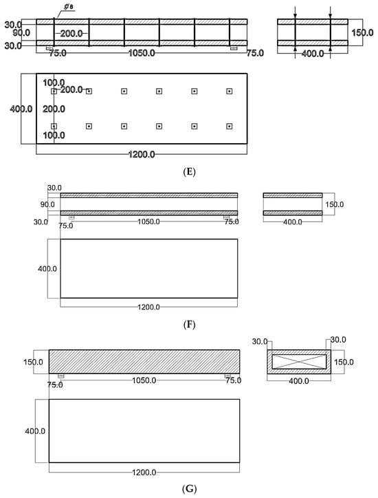 Details of sandwich panel specimens. (A) UC-0-20. (B) UC-0-30. (C) UC-SK-30. (D) UC-SC-30. (E) UC-SPT-30. (F) UC-0-30/M. (G) U-0-30/B.