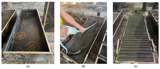 Wet hessian sheets were used to cover each panel specimen. After being cast for 24 h, the specimens were demolded and left to cure for 28 days with wet hessian at a temperature of 22 °C. After 28 days of casting, the applied strain of the post-tension shear connector was half the yield strain—equal to 600 µ strain [56]. Figure 3 illustrates the cast steps for the sandwich panel specimens.