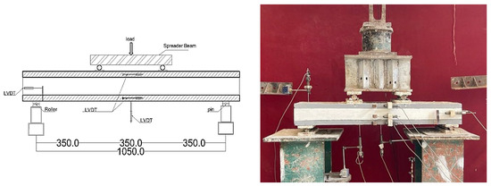 The composite panel specimens were tested horizontally under a four-point bending load. The specimens were supported by a pin 75 mm from the right and left ends, giving an effective span of 1050 mm. Two-point loads were applied at the third point of the span by using a hydraulic jack with total capacity of 300 kN. The load is transmitted onto a spreader beam that transfers the load to two points on the specimens. The test was performed using stroke control at a rate of 2 mm per minute, which increased to 5 mm per minute due to excessive deflection as the panels neared their ultimate capacity. Deflection at the panels’ midspan was measured using a linear variable displacement transducer (LVDT) with a stroke length of 50 mm and an accuracy of 0.001 mm. The relative slip between the CLC layer and bottom layer was measured using an LVDT with a stroke length of 50 mm and an accuracy of 0.001 mm. Two LVDTs with a stroke length of 50 mm and an accuracy of 0.001 mm were used to measure the compression and tensile strains in the midspan of the UHPFRC at the lower and upper layers, respectively. Figure 4 illustrates the test setup and instrumentation. The data were recorded using a digital data accusation system.