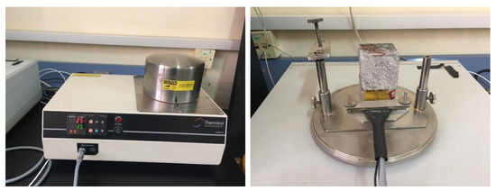 The transient plane source (TPS) technique, also known as the hot disk method, is a widely used and efficient tool for characterizing the thermal properties of materials, particularly thermal conductivity [58]. This method is standardized under ISO 22007-2 [59]; it ensures reliable and accurate measurements. A key advantage of this method is its ability to reduce the impact of contact resistance, enabling precise analysis across various materials. The TPS sensor, designed with concentric rings in a double spiral, functions both as a heater and a thermometer, ensuring uniform heat distribution and accurate temperature readings. In this study, a TPS sensor (model 7577) with a 2.1 mm radius was embedded between two identical disks, as shown in Figure 5. These disks were prepared by cutting cubes 50 mm in length from the center of 100 mm cubes of UHPFRC and CLC.