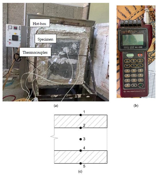 Experimental setup of hotbox test. (a) Hot-box apparatus. (b) Data logger. (c) Thermocouple positions.