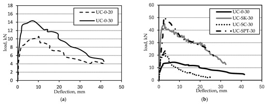Figure 7a demonstrates the impact of UHPFRC thickness. In the case of UC-0-30, increasing the thickness from 20 mm to 30 mm resulted in a 38% increase in maximum load, while the corresponding deflection decreased by 31% when compared to UC-0-20. This change is attributed to the thicker UHPFRC layers [62].