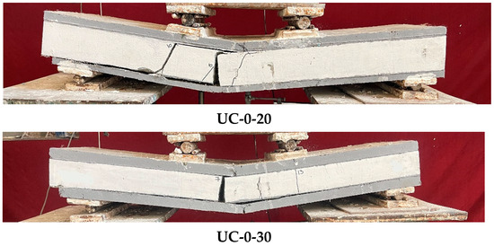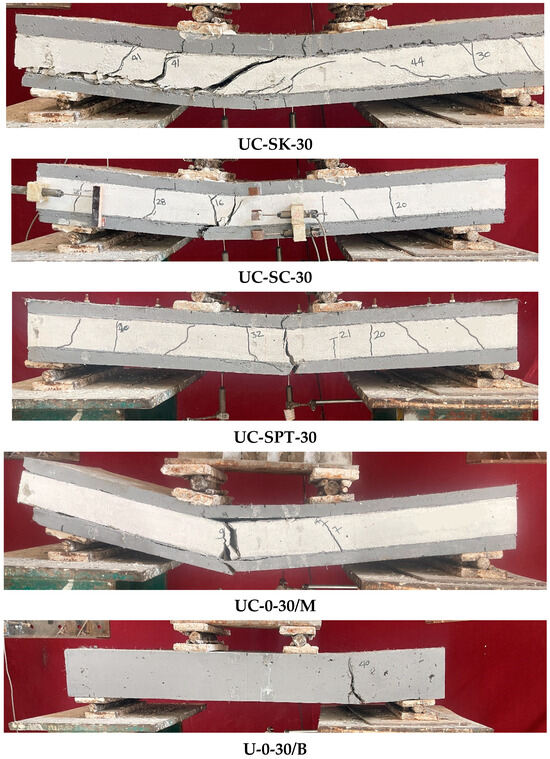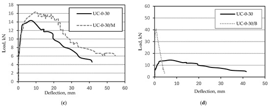 Figure 7c illustrates the impact of using welded steel mesh as a reinforcement for UHPFRC. The load–deflection curve for the UC-0-30/M composite specimen closely resembles that of the specimen without steel mesh, showing only a slight increase in ultimate load of 14% with respect to specimen UC-0-30. This improvement can be attributed to the contribution of the steel mesh reinforcement [32].