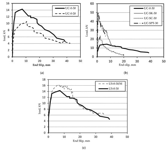 Load–end slip responses for the tested sandwich panel specimens. (a) Effect of UHPFRC thickness. (b) Effect of shear connectors. (c) Effect of UHPFRC reinforcement.