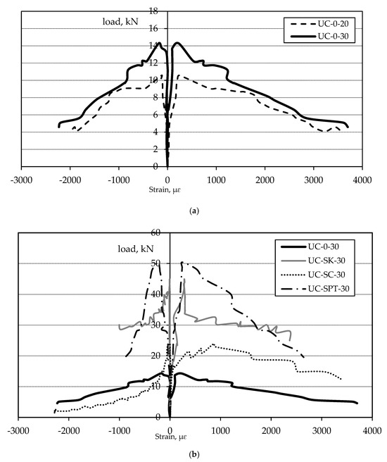 When comparing the behaviors of UC-0-30/B (box section) and UC-0-30, it is evident that UC-0-30 exhibited greater ductility. This is primarily because the box section experienced shear failure, while the failure of UC-0-30 was flexural failure. However, the ultimate load of the box section increased by 186%, as shown in Figure 7d. In the case of the box section, the increased stiffness of the webs enhanced the overall rigidity of the section. However, the load capacity was greater because the shear resistance was lower compared to that of UC-0-30.