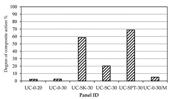 Table 5 illustrates the results of the serviceability loads for different sandwich panel specimens; the serviceability load ranged from 8.16 kN to 45.57 kN. All specimens developed the first crack before the serviceability load. It can be observed that by increasing the wythe layer thickness, the serviceability load increased. On the other hand, by increasing the composite action between layers, the serviceability load increased. Sandwich panel specimens UC-SPT-30, UC-Sk-30, and UC-SC-30 with shear keys achieved a serviceability load greater than the UC-0-30 specimen without a shear key (as cast) by 231%, 200%, and 37%, respectively. In the case of using steel wire mesh, UC-0-30/M was the same as UC-0-30. While in the case of U-0-30/B (box section), the serviceability load was lower than UC-0-30 by 40%.