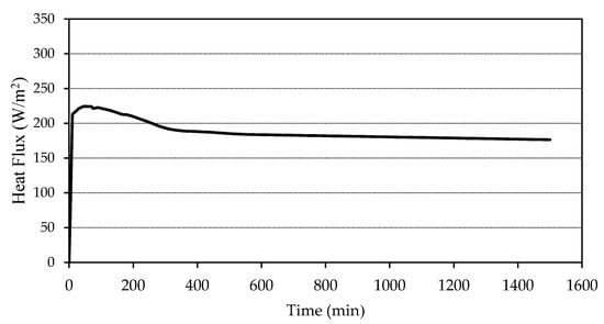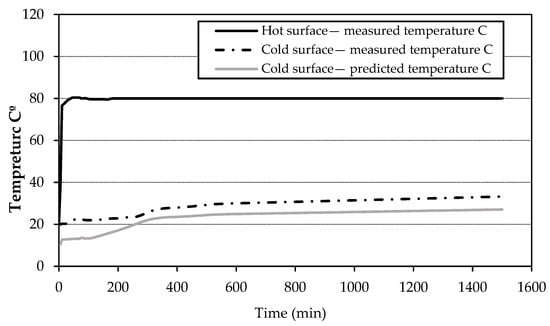 The thermal resistance test for the PSC was performed for UC-0-30 using a hot-box testing apparatus to determine thermal conductivity, following the guidelines set by ASTM C1363 [60], as illustrated in Figure 6. The specimens were equipped with five type-K thermocouples: one on the outer surface to measure the room air temperature, another inside the hot box to assess the internal temperature, two more positioned between the UHPFRC and CLC layers, and one located in the center of the CLC layer to evaluate heat transfer across the sandwich layers, as shown in Figure 6. Additionally, a heat flux sensor was attached to the specimens to track the heat flow rate (q). All instruments were connected at one end to the sample surface and at the other end to a data logger. The hot-box apparatus featured a window measuring 500 × 800 mm, where the specimens were mounted, as shown in Figure 6. The surface of the specimens facing the interior of the hot box is referred to as the hot face, while the surface exposed to the ambient air is known as the cold face. The hot surface of the hot box was set to a temperature of 80 °C for the inner wall, while the cold surface was set to a temperature of 21 °C. The devices were linked to a data logger for continuous monitoring. Data acquisition was maintained throughout the experiment for 25 h, with readings recorded every 10 min until steady-state conditions were achieved for each test.