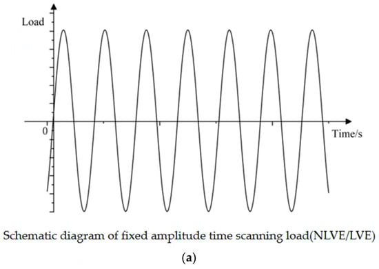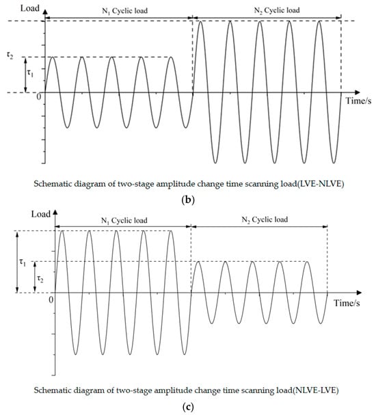 Considering the linear viscoelastic range of asphalt and the time required for the test, the focus is on the selection of appropriate LVE (linear) and NLVE (nonlinear) loads for the time-scan test. Taking Pen70–80 asphalt as an example, the test program was designed by selecting an LVE load of 150 kPa within its linear viscoelastic interval and a NLVE stress of 300 kPa outside the linear viscoelastic interval. The constant stress scanning loading has only one stage, which is carried out under LVE or NLVE constant stress loading until the specimen fails by fatigue, respectively. The variable stress scan loading mode was divided into two stages. In the first stage, the load τ1 is applied to the sample for n1 cycles. In the second stage, a load τ2 different from τ1 is applied until the specimen fails due to fatigue. The number of cycles of the second stage load τ2 derived from the experimental results is denoted as n2. Different asphalt samples were tested at different combinations of stress levels and loading cycles depending on the yield stress.
