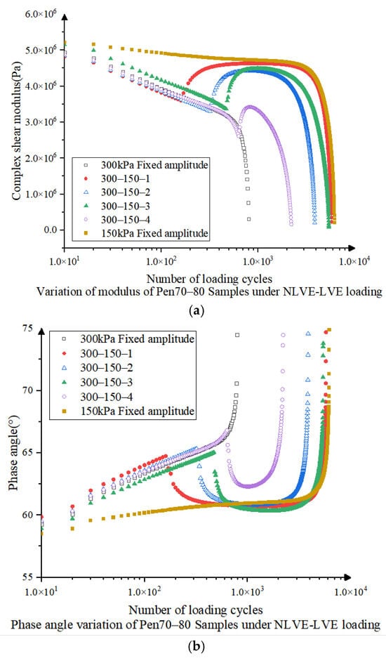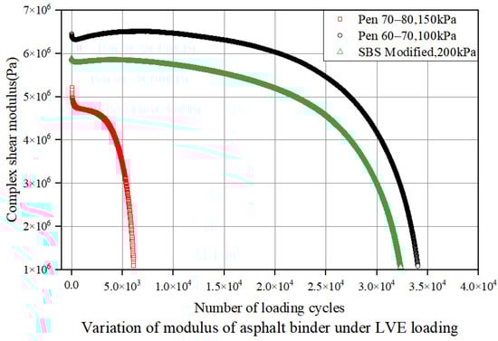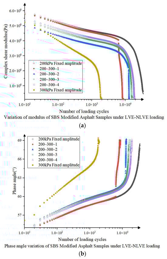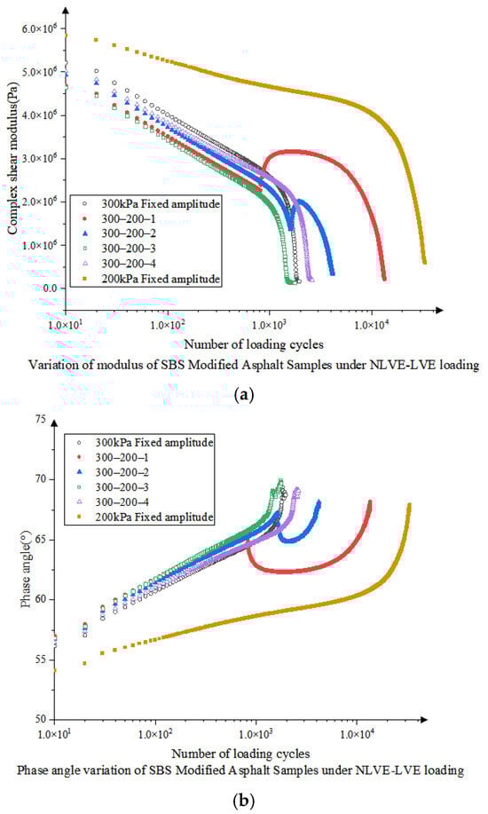 In order to obtain data closer to the mechanical response parameter data of asphalt binder under actual vehicle loading, this study carries out the time-scan test under four loading modes, namely, LVE, NLVE, NLVE-LVE, and LVE-NLVE, and applies cyclic loading to the specimen using a dynamic shear rheometer (DSR) to observe the change rule of the rheological parameters and evaluate the specimen fatigue resistance in this way [34]. DSR is able to provide the composite shear modulus (it is an indicator of the overall shear strength of the asphalt mixture) and phase angle (this refers to the phase difference between the deformation of asphalt under load and the load action, i.e., the speed of reaction of asphalt after being subjected to an external force.), which are two parameters that reflect the rheological properties of the material well, and has been widely used in the fatigue evaluation of cementitious materials, as well as in the prediction modeling of their fatigue life [35,36,37]. Under repeated constant or variable stress loading, the integrity of the specimen is gradually impaired, and its load-carrying capacity is further reduced, which is manifested as a decrease in the modulus. This is also accompanied by an increase in phase angle, which can reflect the process of fatigue damage accumulation to some extent.