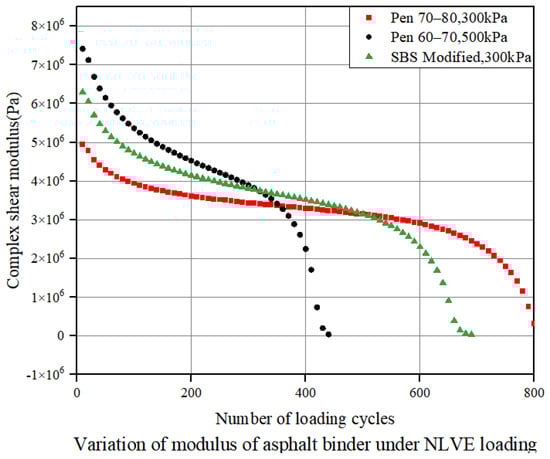 In past studies on fatigue performance, fatigue tests on asphalt binders were usually controlled by constant stress, and the analysis of binder fatigue life results typically followed the Miner linear damage accumulation criterion [16,26]. This criterion assumes that all load sizes cause the same type of damage to asphalt binders, with the damage from continuous loads being simply linearly accumulated. Experimental design methods based on the Miner criterion treat the loads experienced by asphalt binders equivalently, resulting in a linear damage accumulation model [27]. However, in real traffic conditions, asphalt materials on road surfaces are subjected to varying sizes of axle loads in alternation. The damage to the pavement caused by the switching process of different amplitude axle loads is not simply linearly cumulative. In addition, the predictions of the model correlate poorly with asphalt binder fatigue and do not accurately predict road service life [28]. The prediction accuracy of established traditional fatigue models under actual traffic loads is still to be discussed, and whether they have authenticity and reliability has not been determined. Therefore, it is necessary to consider the influence of heavy traffic load, introduce NLVE stress to simulate the actual road conditions, design two stress combinations of LVE-NLVE and NLVE-LVE, explore new ideas of fatigue test from the level of binder, and improve the damage evolution mechanism according to the theory of fatigue damage accumulation, so as to make it more in line with the actual traffic conditions.