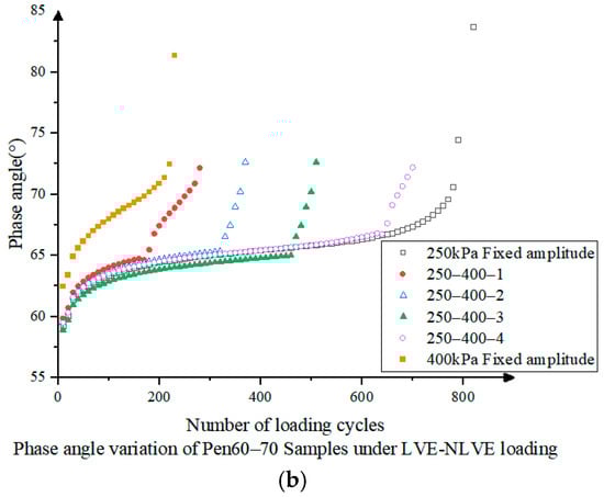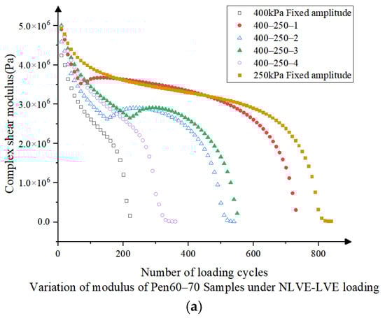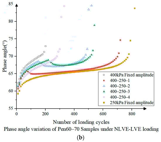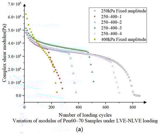 In Figure 8, Pen60–70 asphalt in NLVE-LVE stress loading mode, the same damage recovery phenomenon of modulus increase and phase angle decrease is observed from 400-250-1 to 400-250-3 loading modes, and the maximum value of the composite shear modulus decreases with the increase in the damage fraction. The degree of composite shear modulus recovery is negatively correlated with the number of NLVE stress cycles, and its maximum value is also between the maximum values of LVE and NLVE constant stress scans. However, in the 400-250-4 loading mode, the damage fraction in the first stage is 0.8, and the samples are more damaged in the first stage, and the curves of the composite shear modulus and phase angle with the number of load cycles are more similar to those of the 400 kPa constant amplitude loading mode, which do not show the phenomenon of damage recovery.