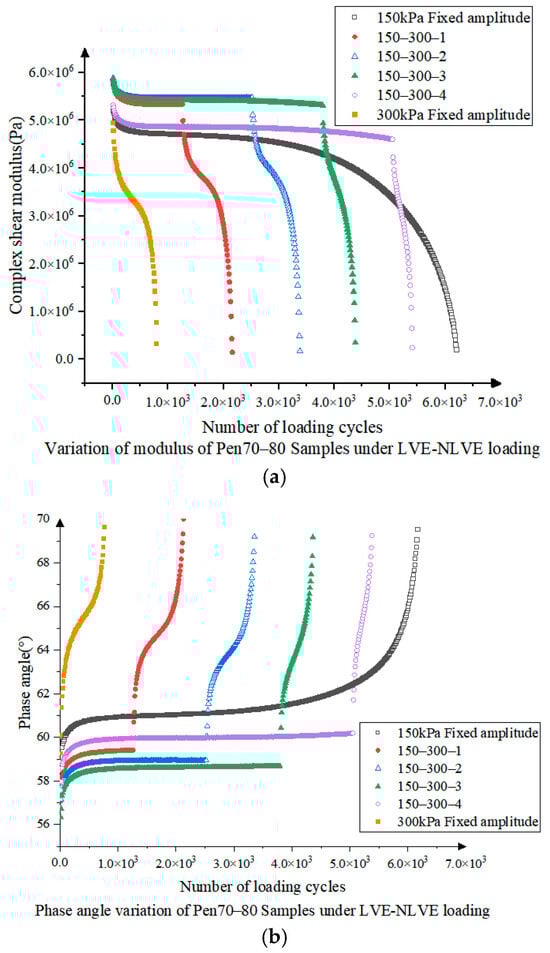 In the early stages of the second phase, transitioning to NLVE stress, the Pen70–80 sample in Figure 10 experiences a rapid decrease in deformation resistance. However, in both the 150-300-2 and 150-300-3 modes, the rheological curves undergo three distinct stages, starting with a rapid damage phase, followed by a slowdown in damage accumulation, and finally, a rapid increase in damage rate leading to fatigue failure.