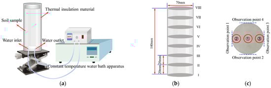 A self-constructed testing apparatus was employed to conduct the experiment, as depicted in Figure 1a. The apparatus is fabricated from organic glass material, with internal dimensions measuring 70 mm in diameter and 140 mm in height, and with the help of a constant temperature water bath and heat-proof material to achieve temperature control of 20 °C, 40 °C, 50 °C, and 60 °C, respectively. The specimen was divided into eight sections (labeled as I, II ~ VIII) with a 20 mm interval from top to bottom, as illustrated in Figure 1b.