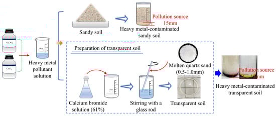 A preliminary framework for the remediation technology system, encompassing bioremediation, physical remediation, and chemical remediation technologies, was established [,,]. However, the implementation of large-scale soil remediation work with varying pollution levels remains challenging for the economy and efficiency []. Grasping the migration law of heavy metals in soil can accurately predict the pollution range and level and prompt science remediation []. The development of transparent soils with properties similar to natural soils has created opportunities for visual research on the internal structure of soils [,]. At present, transparent soil has been widely used in the research field of soil hydraulics because of its excellent applicability [,]. For instance, transparent soil was employed to investigate the interaction between pile body and surrounding soil during the process of pile formation [].
