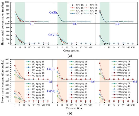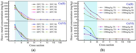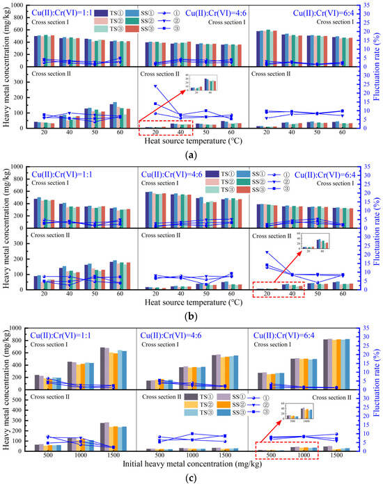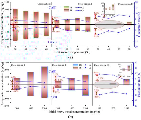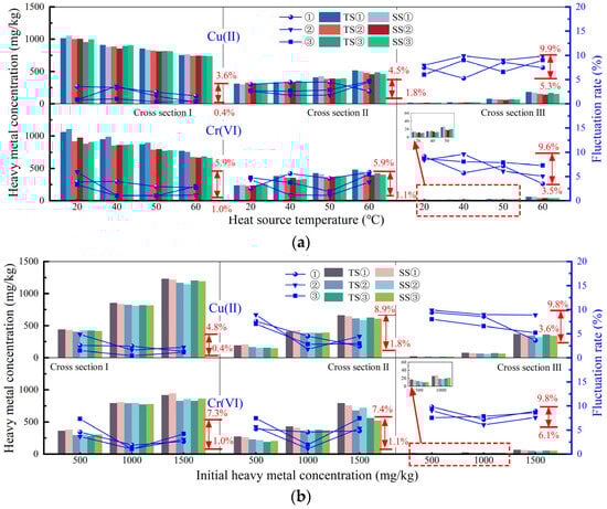 Lateral comparison of concentration distributions and fluctuation rates of Cu(II) and Cr(VI). (a) Different heat source temperatures at 1000 mg/kg. (b) Different initial heavy metal concentrations at 50 °C.