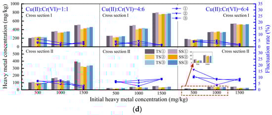 Horizontal comparison of concentration distributions and fluctuation rates of Cu(II) and Cr(VI) composite heavy metal-contaminated soil. (a) Cu(II) under different heat source temperatures at 1000 mg/kg. (b) Cr(VI) under different heat source temperatures at 1000 mg/kg. (c) Cu(II) under different initial heavy metal concentrations at 50 °C. (d) Cr(VI) under different initial heavy metal concentrations at 50 °C.