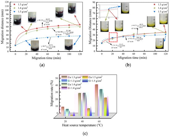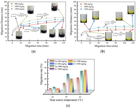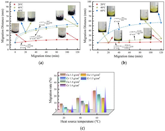 Migration effect of single Cu(II) or Cr(VI) at different heat source temperatures. (a) Comparison of Cu(II) migration distances. (b) Comparison of Cr(VI) migration distances. (c) Migration rates of single heavy metal under different heat source temperatures.