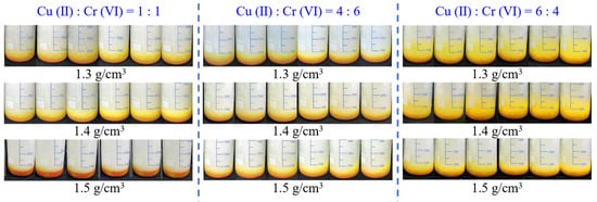 Taking the initial concentration of 1000 mg/kg and the heat source temperature of 60 °C as an example, the migration behavior of composite heavy metals was analyzed under different dry density conditions (Figure 9). The prominence of blue-green is not observed in transparent soil. Currently, only the distribution of orange-yellow for the two heavy metals can be seen. As the dry density of the soil increases, the proportion of the orange-yellow area decreases gradually. Notably, at a dry density of 1.5 g/cm3 and a Cu(II) to Cr(VI) ratio of 1:1, an intense orange-red color interface is observed. This phenomenon indicates that the migration of heavy metal pollutants is characterized by a slow rate when the dry density of composite heavy metals reaches 1.5 mg/kg.