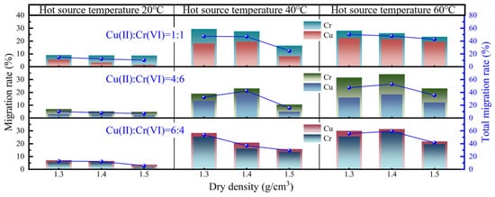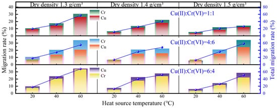 Figure 11c demonstrate a positive correlation between temperature and the migration rates of Cu(II) or Cr(VI), suggesting that temperature exerts a significant influence on the mobility of heavy metals within soil. Combined with Figure 10 and Figure 11, it is evident that both heat source temperature and dry density significantly impact the migration of single Cu(II). However, for a single Cr(VI), the influence of heat source temperature outweighs that of dry density.