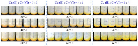 Taking the dry density of 1.3 g/cm3 and the initial concentration of 500 mg/kg as an example, the migration of composite heavy metals at different heat source temperatures was analyzed (Figure 12). It shows that the proportion of orange-yellow regions increases with increasing temperature. Compared to other groups, the absence of a significant temperature gradient at a heat source temperature of 20 °C resulted in an inconspicuous upward migration of Cu(II) and Cr(VI). When the heat source temperature is set to 60 °C, the proportion of the orange-yellow region in the sample reaches its maximum. At this time, there is a blurred and fluctuating color interface, yet the overall trend remains consistently upward.