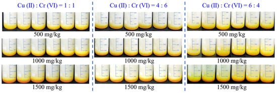 Copper chloride and potassium chromate were used to provide heavy metal ions of Cu(II) and Cr(VI). Based on the screening values for Cu(II) and Cr(VI) in the current soil pollution risk control standards for agricultural land (GB15618-2018), the contaminated concentrations were established at 500, 1000, and 1500 mg/kg (on a dry soil mass basis). The ratios of composite ions Cu(II) to Cr(VI) in the resulting heavy metal-contaminated soil were set at 1:1, 4:6, and 6:4, respectively. Furthermore, in the experimental design, three parallel experimental groups were established for each condition to ensure the accuracy and rigor of the test data.