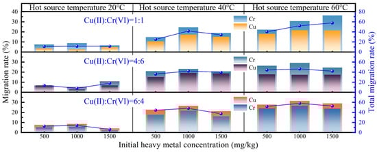 The migration effect of composite heavy metals at different heat source temperatures is illustrated in Figure 13. The total migration rate and migration rate of composite heavy metals increase gradually with the rise in heat source temperature under identical conditions. In addition, the migration rate of Cr(VI) is observed to be higher than that of Cu(II) when the ratio between them is 1:1, suggesting that the migration of Cr(VI) is more influenced by temperature compared to Cu(II).