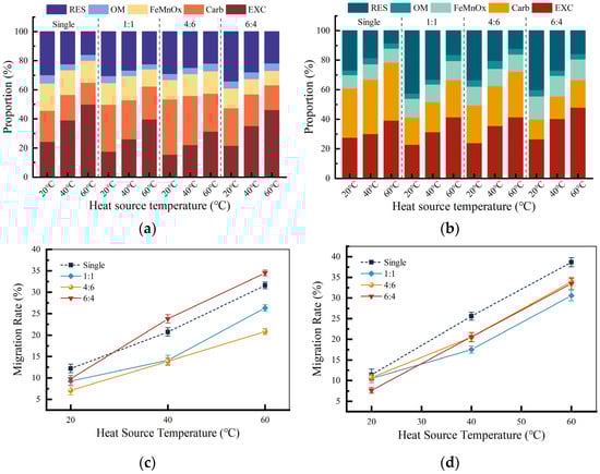 The results depicted in Figure 17 demonstrate that for Cr(VI), the proportion of the EXC state and Carb state gradually increases with the rise in heat source temperature across all four types of contaminated soil, while the proportion of the RES state decreases correspondingly. Notably, this trend is contrary to that observed for Cu(II). Primarily due to the weak acidity of chromic acid, an increase in temperature leads to a rise in soil ambient pH value, consequently resulting in an elevation of the proportion of the Carb state that exhibits high sensitivity toward changes in pH value. Under the influence of the temperature of each heat source, the proportion of the Carb states of Cr(VI) in different types of contaminated soils was ranked as follows: single > 4:6 > 1:1 > 6:4. The composite ratio of Cu(II) and Cr(VI) varies, leading to distinct pH values in the soil environment. Consequently, the proportion of the Carb states in their respective soils also differs. The migration rate of Cr(VI) in various polluted soils increases with the rise in temperature gradient, as evidenced by the combination of Figure 17d. This phenomenon is attributed to the escalating proportion of the EXC and Carb states.