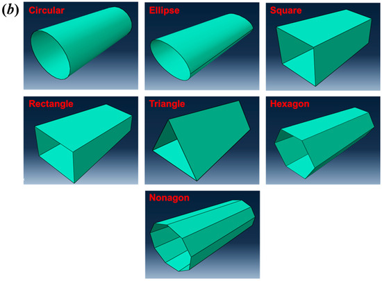 The development of the finite element model under oblique impact loading is detailed by addressing its key components, including the geometry, finite element meshing, interaction and boundary conditions, and material properties. The oblique dynamic impact energy absorption behavior of straight and tapered tubes for circular, ellipse, square, rectangle, triangle, hexagon, and nonagon designs was compared. Figure 3 presents the straight and tapered thin-walled structure geometry used in this study.